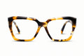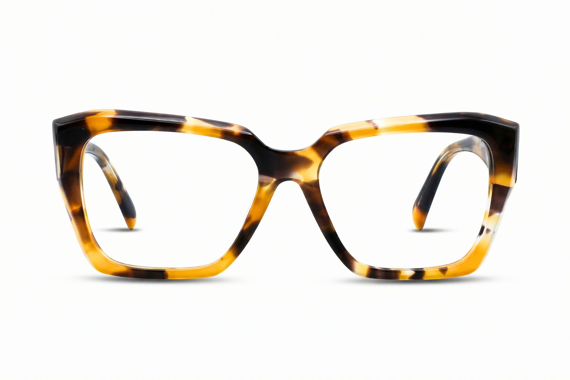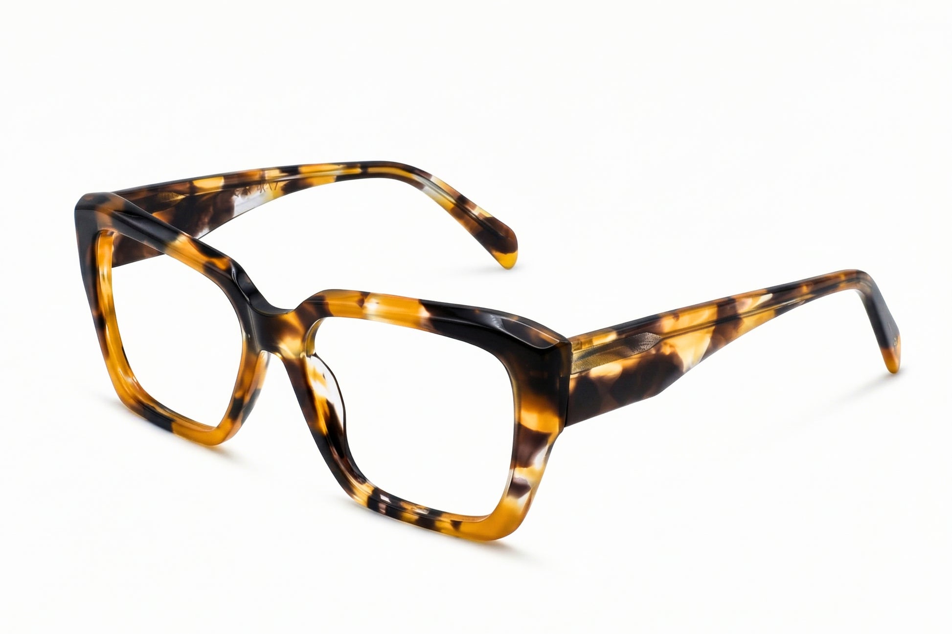 Montura de acetato en tonos carey con contraste cálido y profundidad visual.